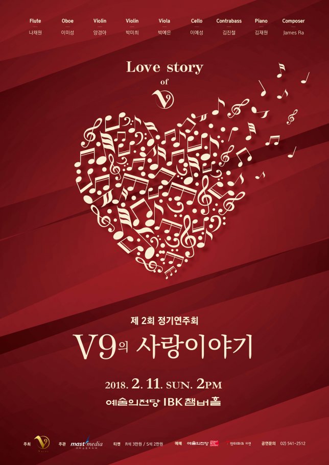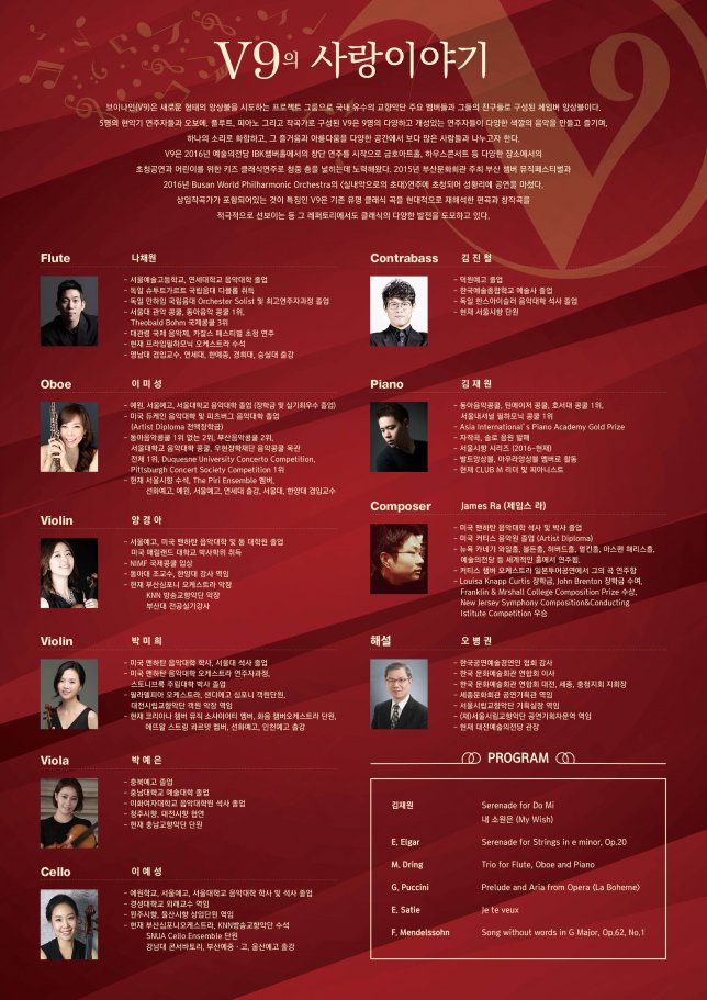 브이나인(V9)은 새로운 형태의 앙상블을 시도하는 프로젝트 그룹으로 국내 유수의 교향악단 주요 멤버들과 그들의 친구들로 구성된 체임버 앙상블이다. 5명의 현악기 연주자들과 오보에, 플루트, 피아노 그리고 작곡가로 구성된 V9은 9명의 다양하고 개성있는 연주자들이 다양한 색깔의 음악을 만들고 즐기며, 하나의 소리로 화합하고, 그 즐거움과 아름다움을 다양한 공간에서 보다 많은 사람들과 나누고자 한다.