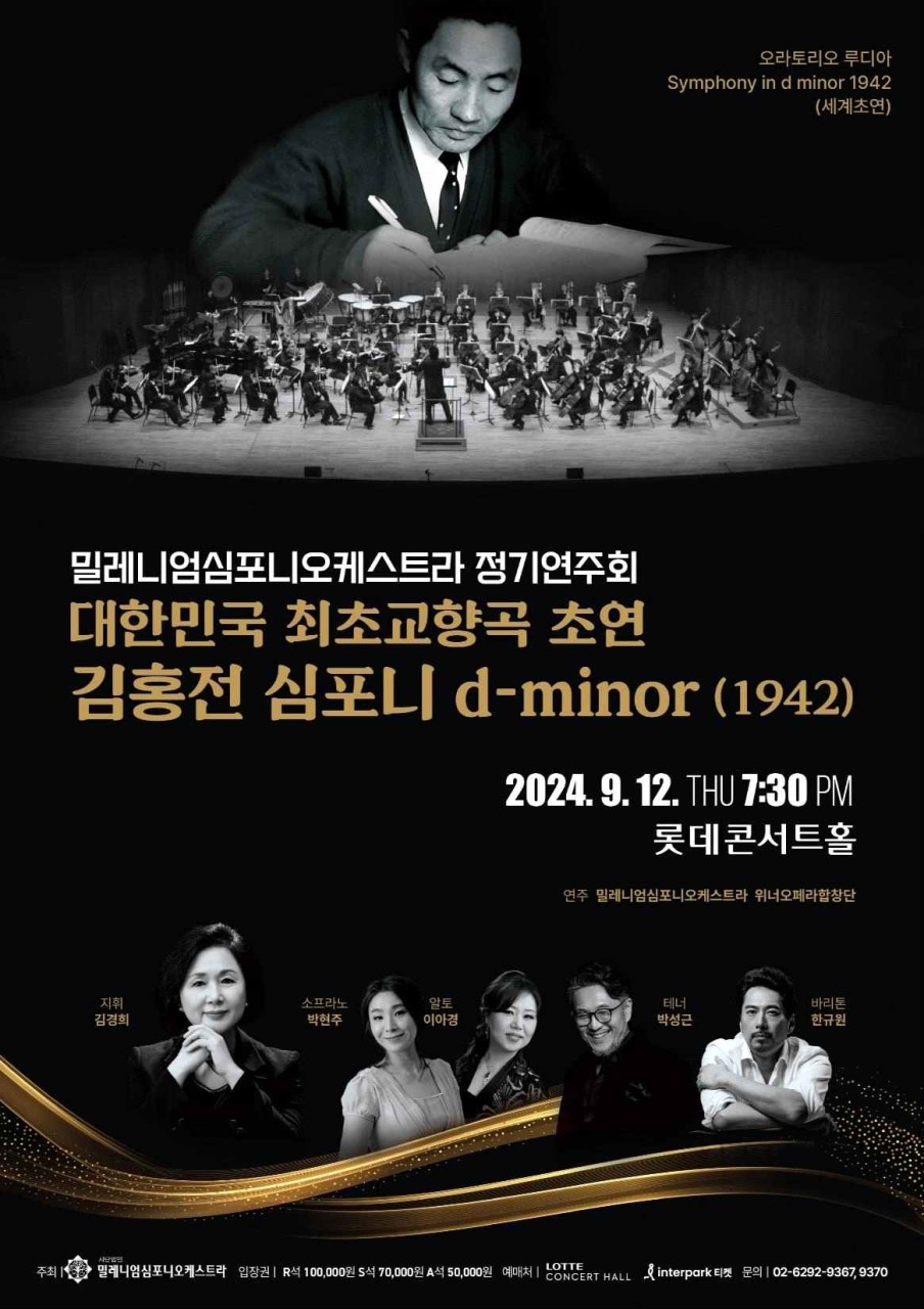 밀레니엄 심포니오케스트라가 오늘 9월12일 롯데 콘서트홀에서 김홍전 작곡가 탄생110주년 기념으로 대한민국 최초의 교향곡 ‘ Symphony d-minor’ 를 세계 초연합니다.
