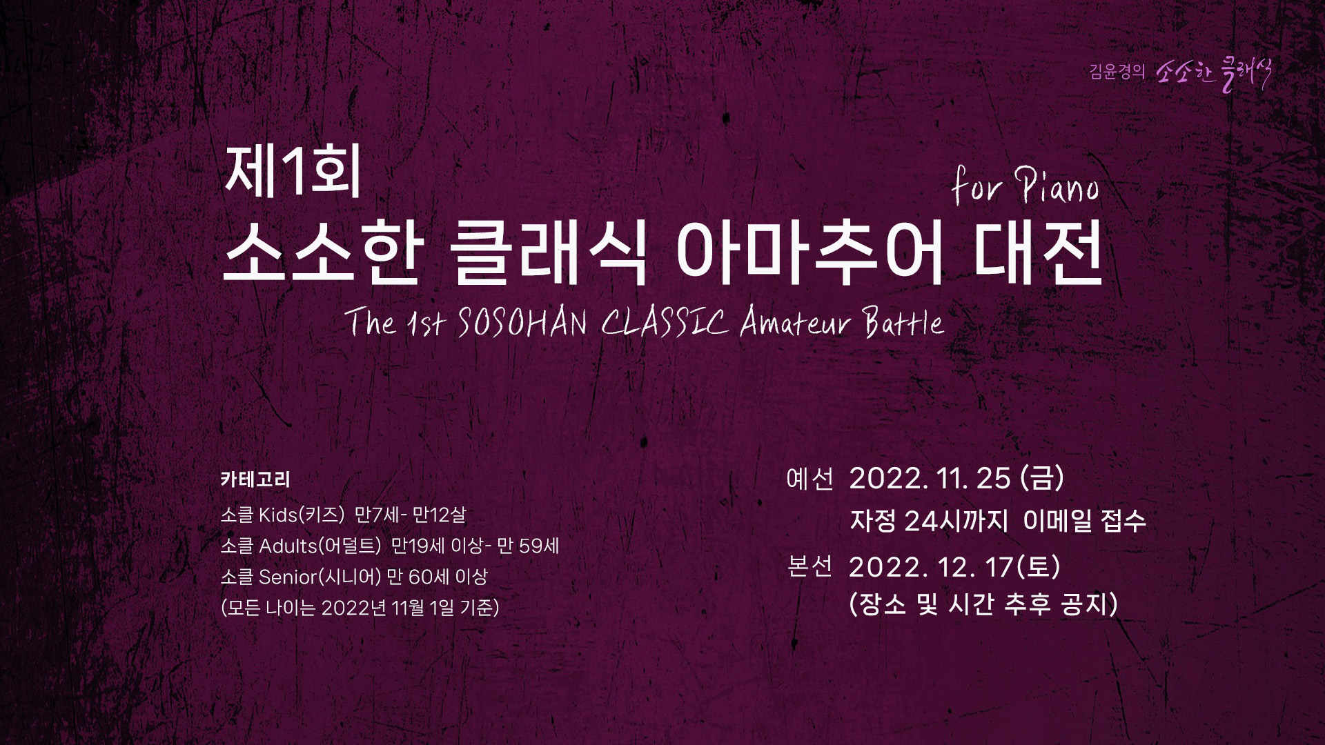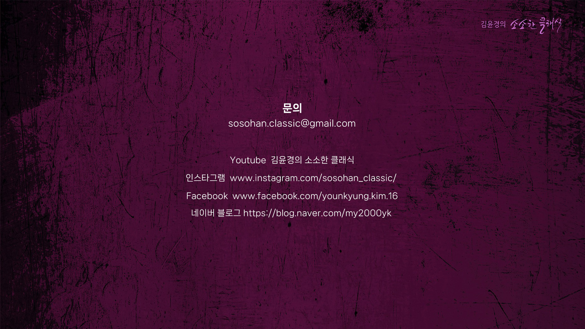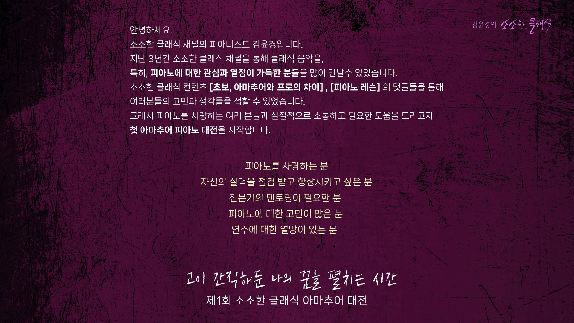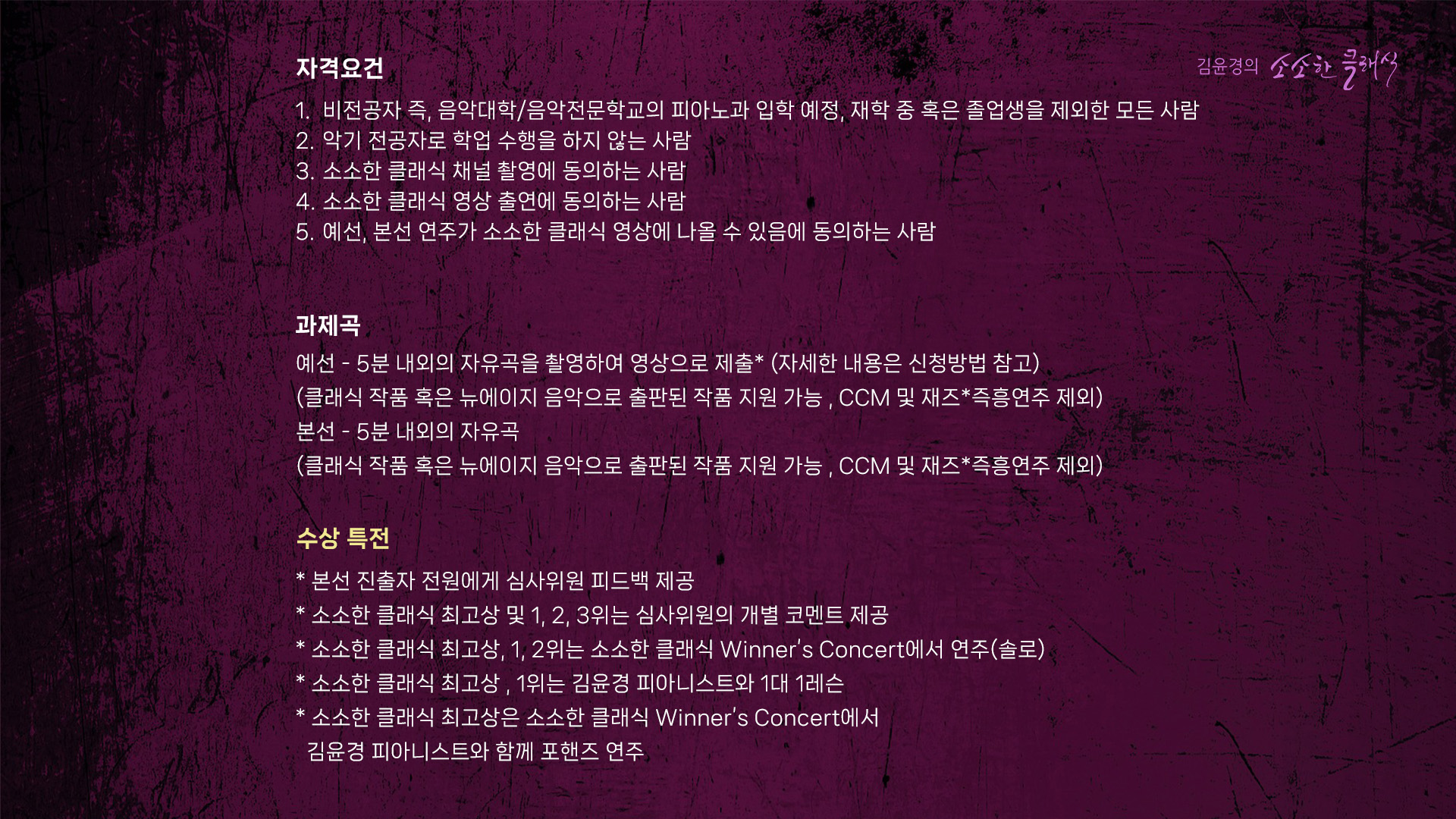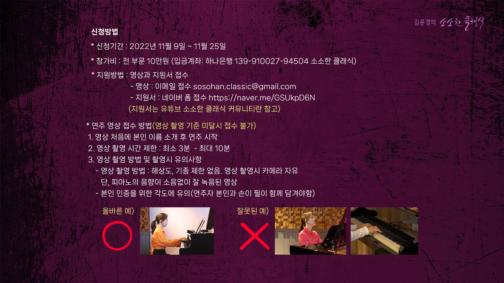 - 자세한 내용은 네이버 ‘피아니스트 검색’ 후 블로그 및 유튜브 '김윤경의 소소한 클래식' 커뮤니티, 혹은 김윤경 집사님(sosohan.classic@gmail.com/010-9230-3690)에게 문의 바랍니다.