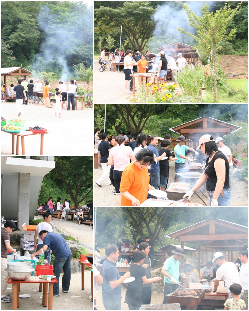 먼저, 모두가 즐거웠던 식사시간입니다. 바베큐장에서 맛있게 익혀진 고기와 맛난 냉면과 신선한 과일들...