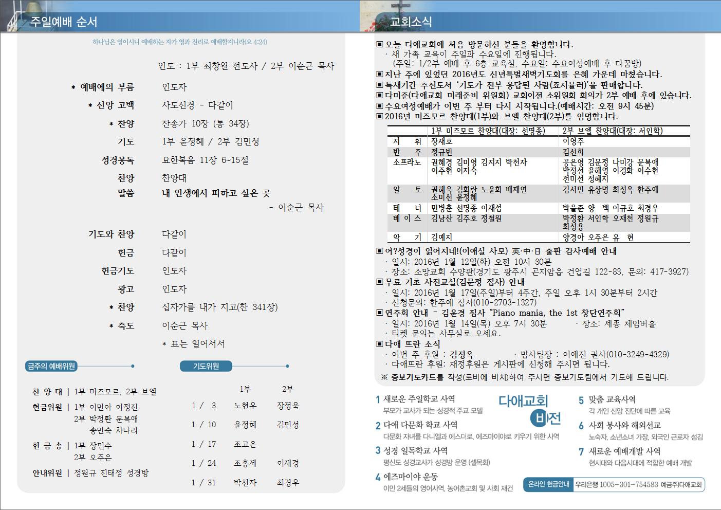 2016년 1월 10일 주일예배 주보