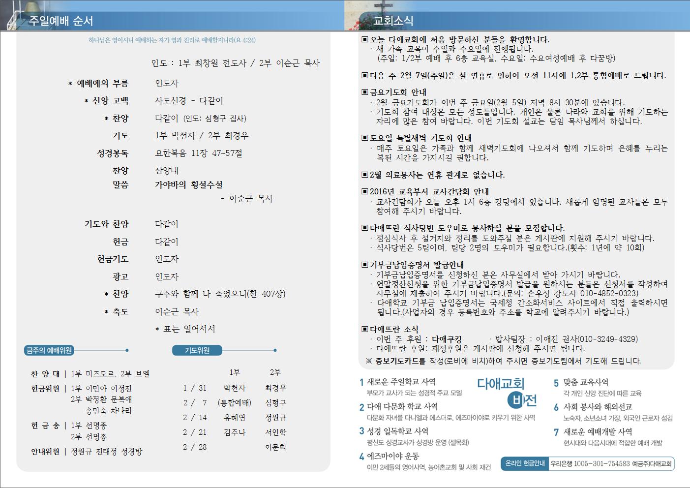 2016년 1월 31일 주일예배 주보