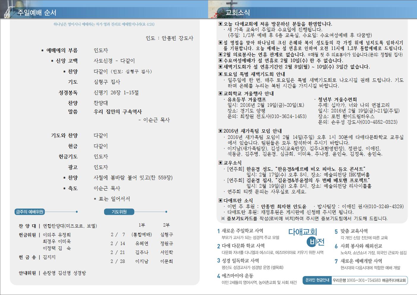 2016년 2월 7일 주일예배 주보