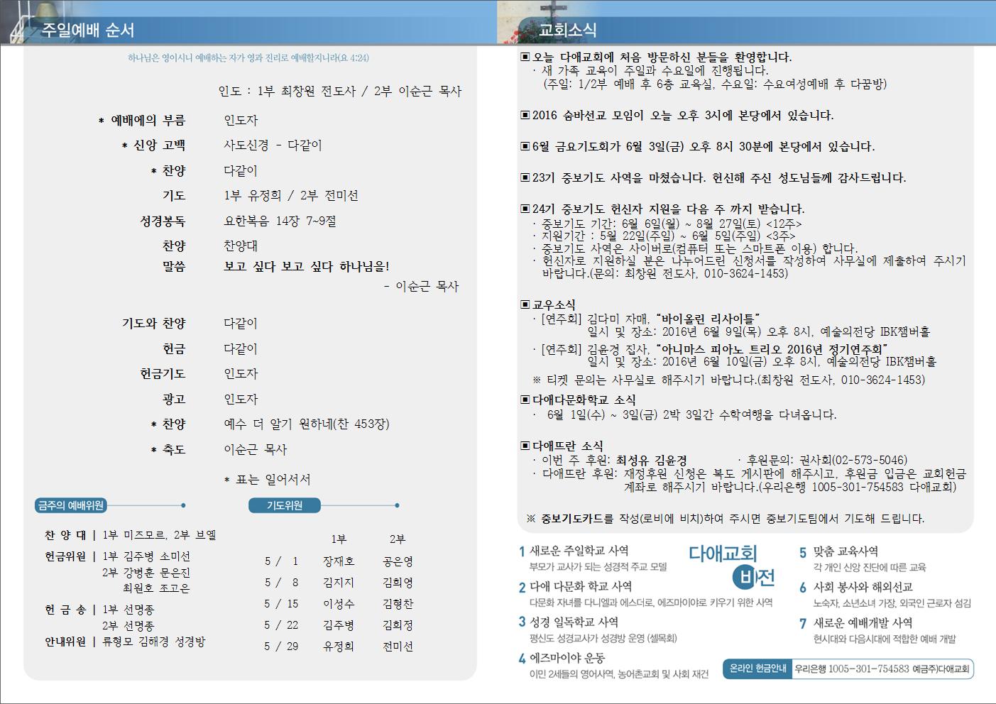 2016년 5월 29일 주일예배 주보