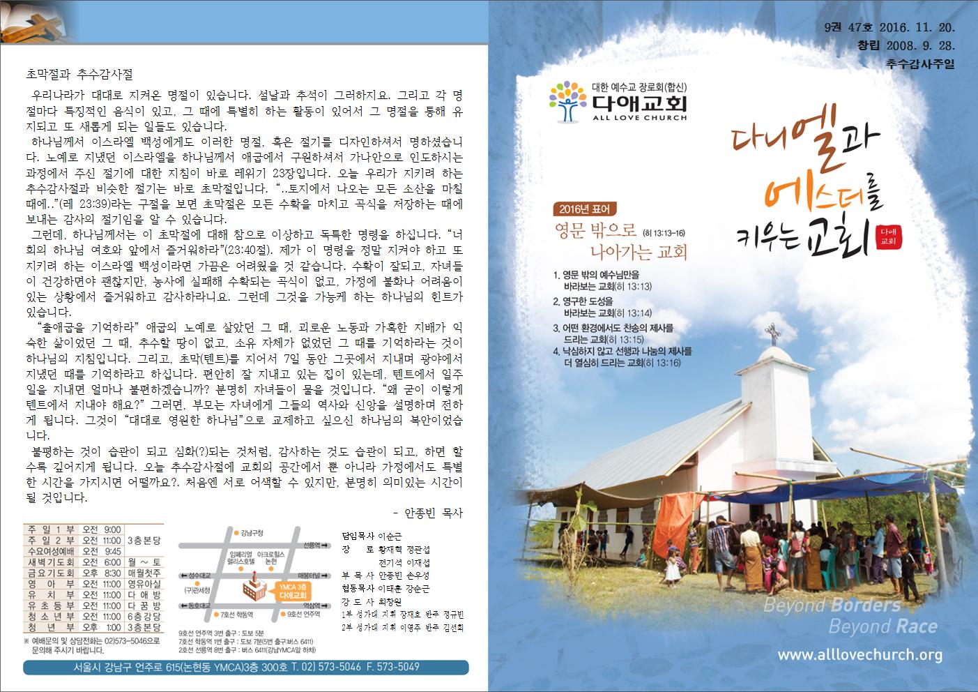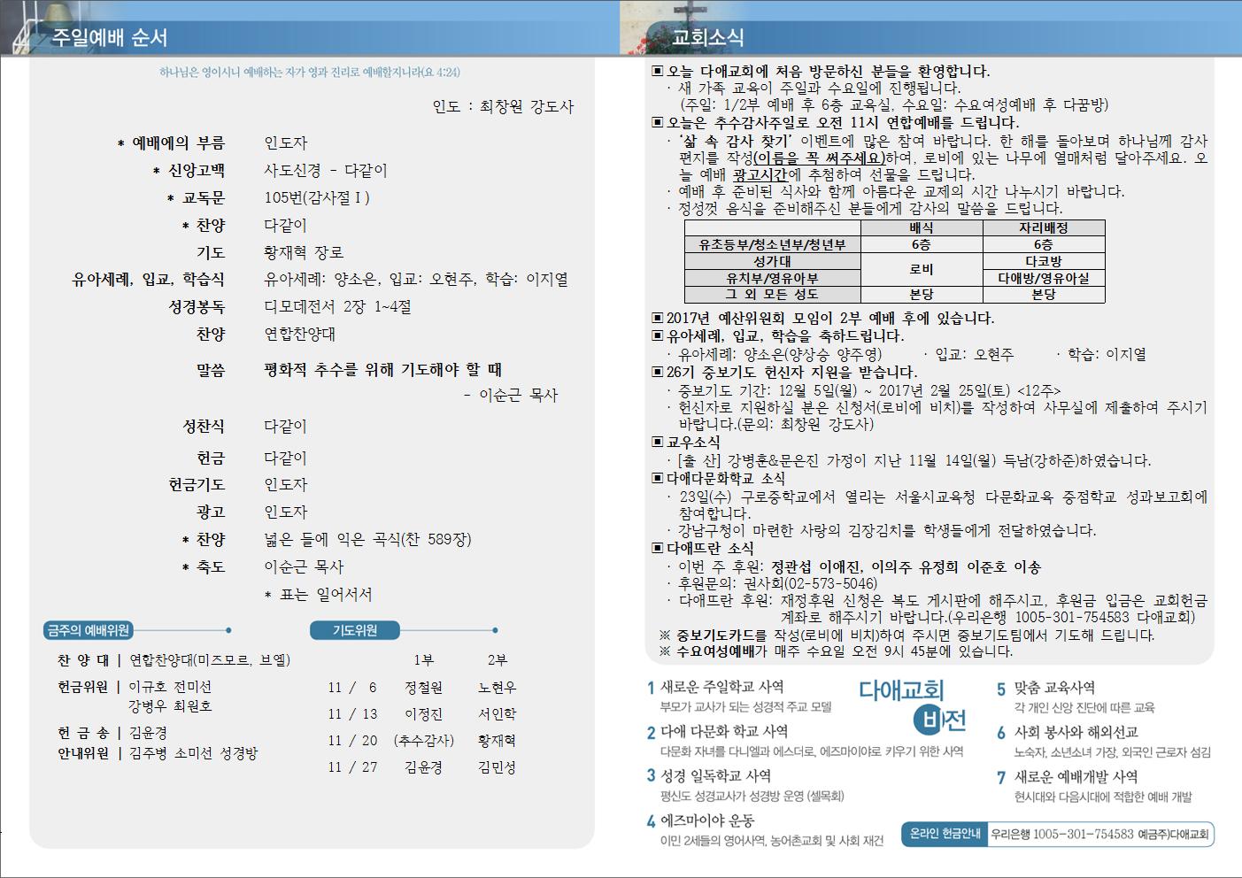 2016년 11월 20일 주일예배 주보