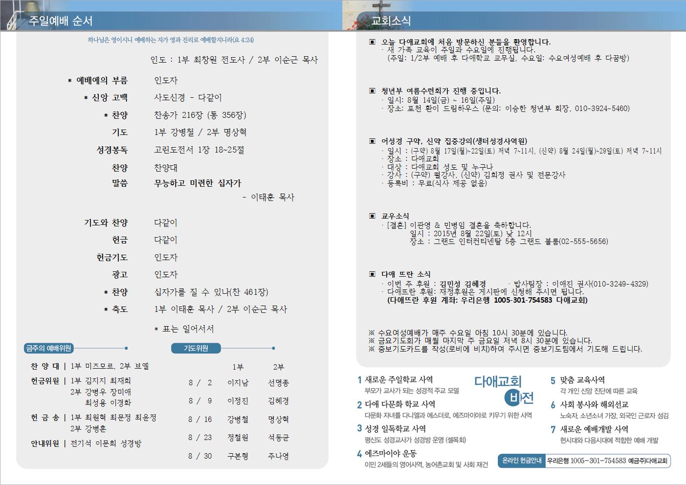 2015년 8월 16일 주일예배 주보