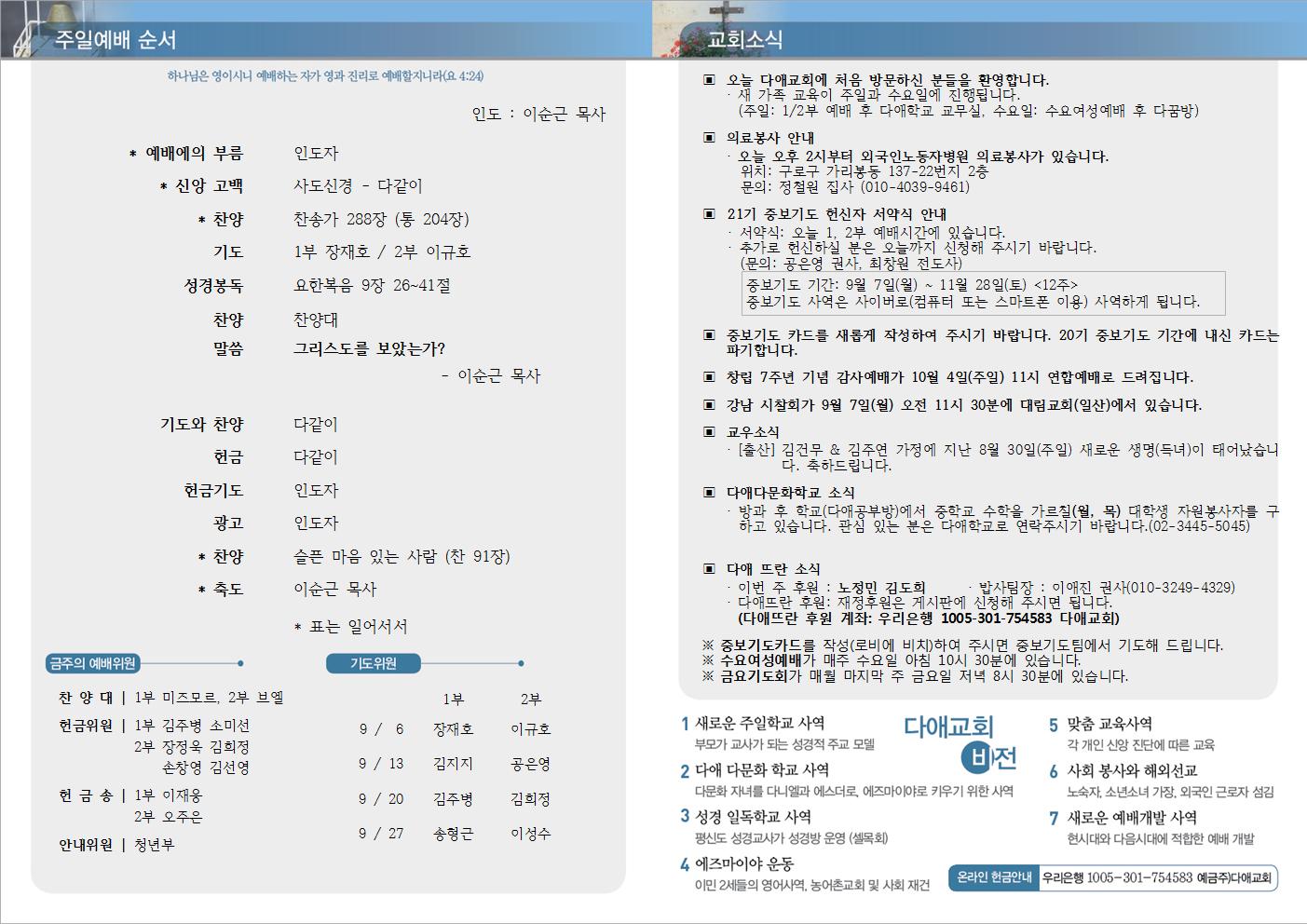 2015년 9월 6일 주일예배 주보