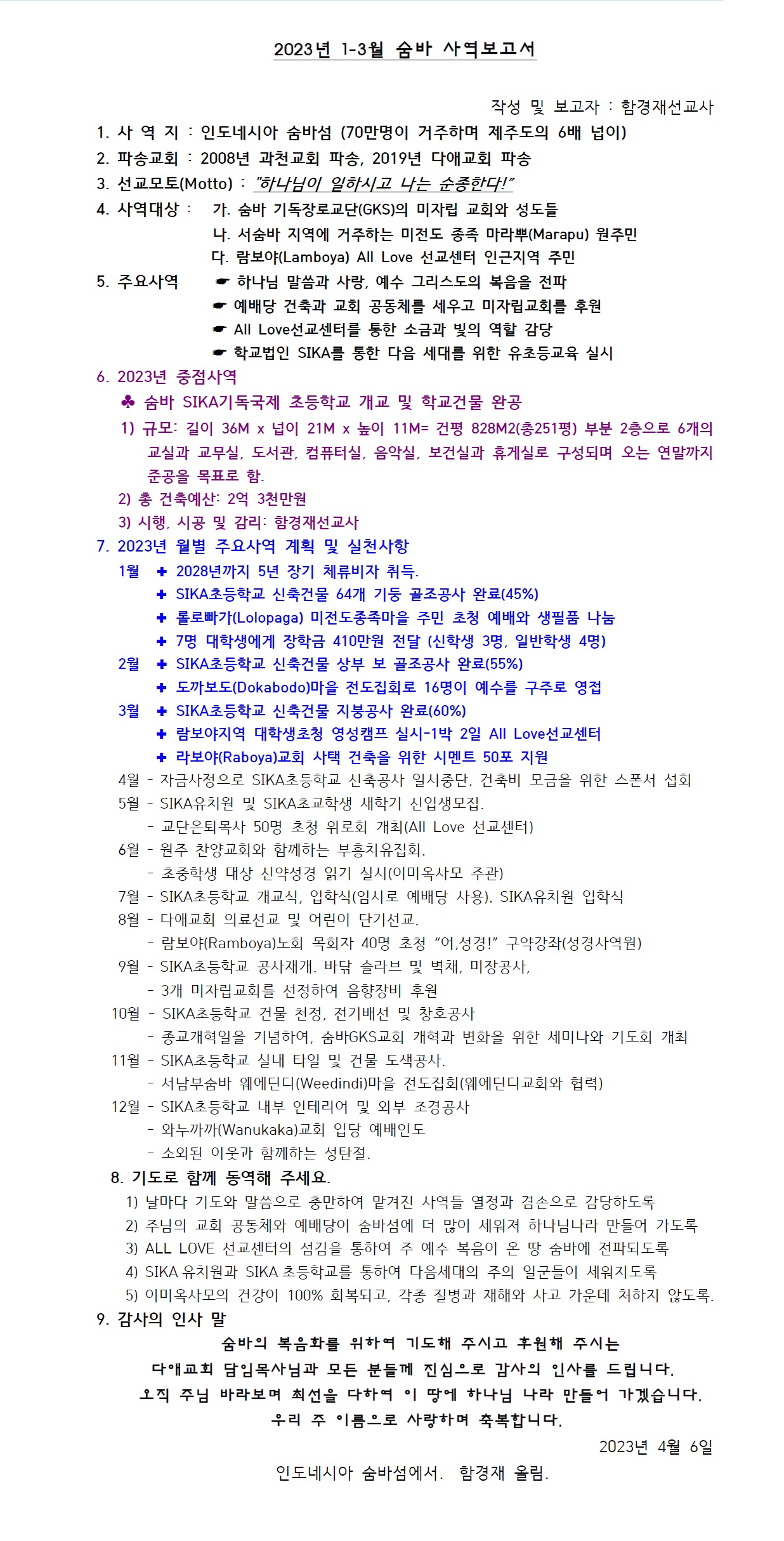 2023년 1분기 다애교회 숨바선교 보고서 -함경재 선교사