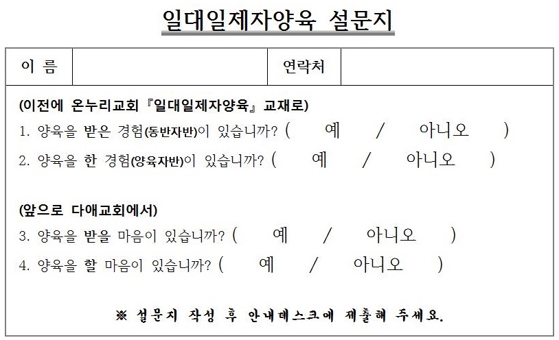 일대일제자양육 설문지를 작성한 후 안내데스크에 제출하여 주시기 바랍니다
