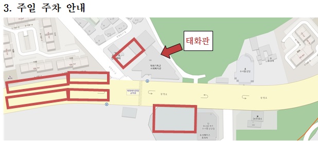 1)태화복지관(인근 주민 같이 사용), 2)도로변, 3)수서교회 옆 공터
