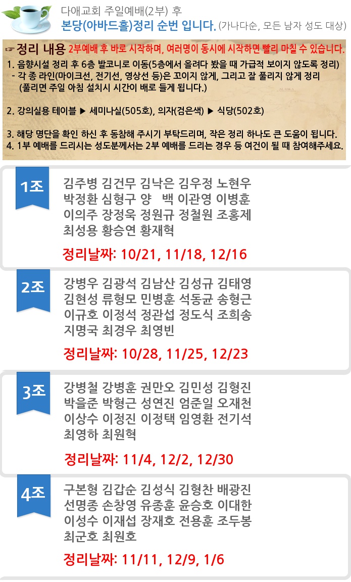 3.본당(아바드홀)정리에 모든 남성 성도님들께서 참여해 주시길 바랍니다.