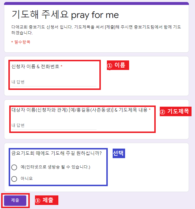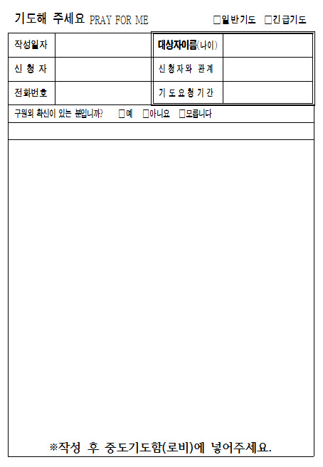 2. 중보기도신청 카드(안내데스크 비치) 작성 후 중보기도함 제출