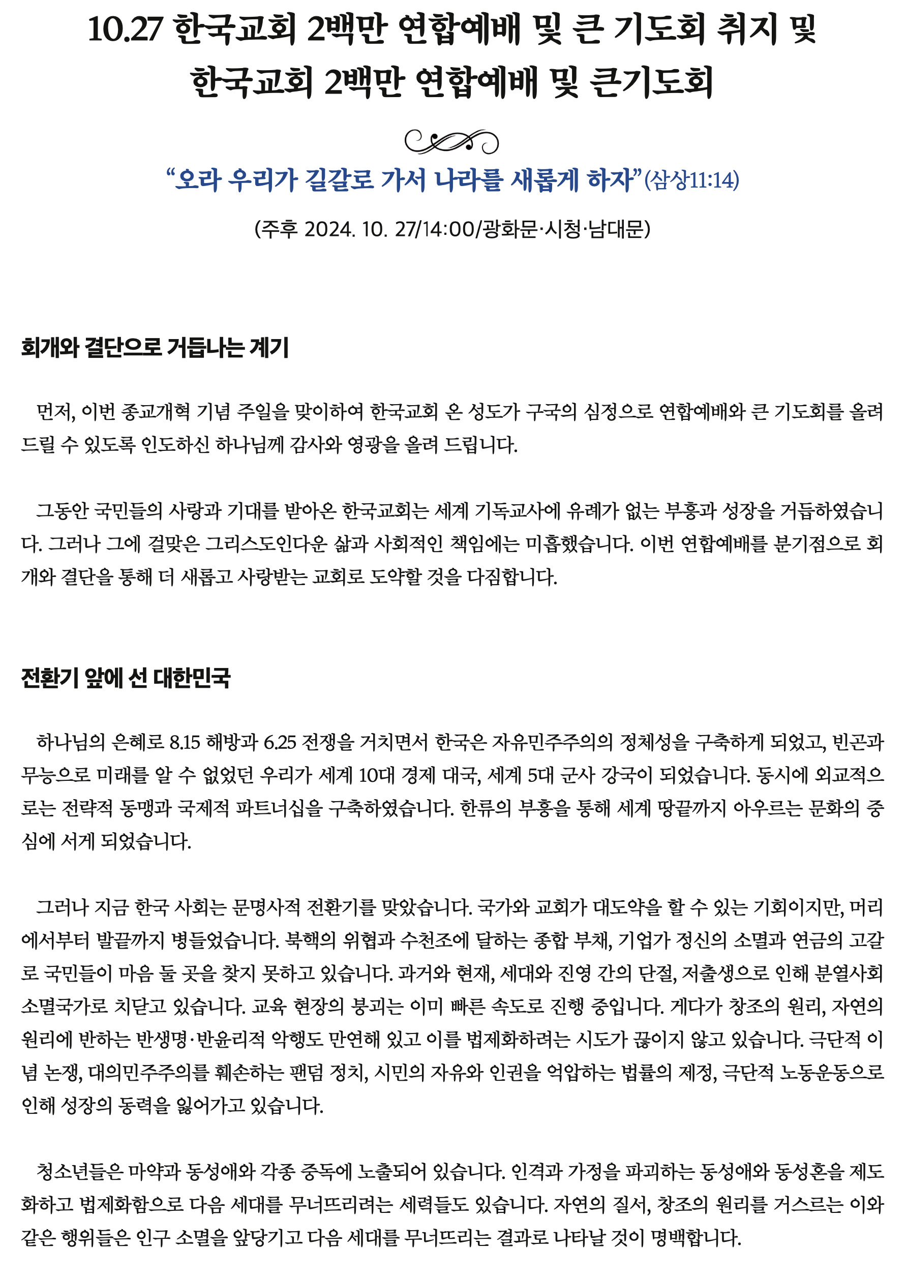 10.27<악법저지를 위한> 2백만 연합예배 찬양&큰 기도회 안내